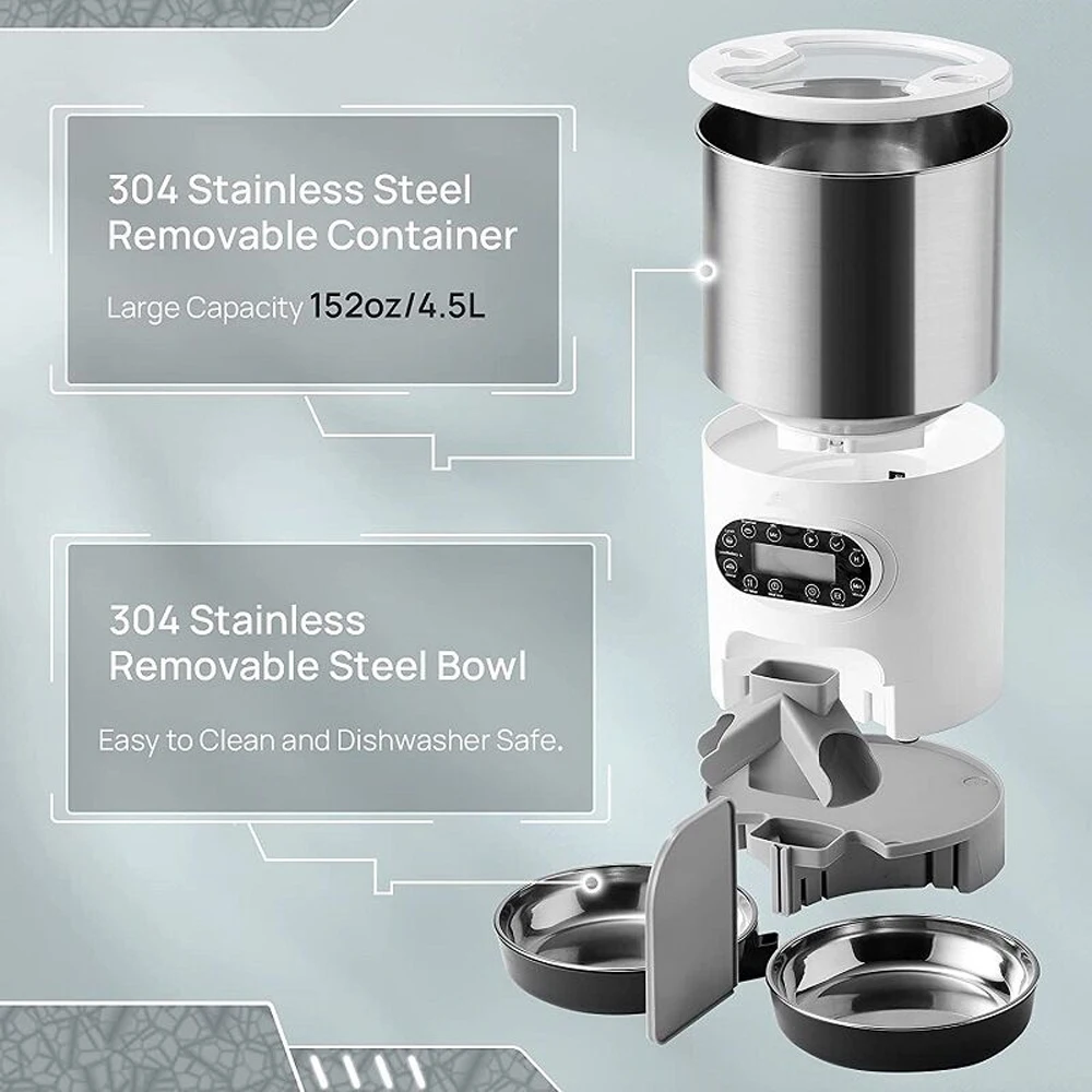 Easy & Friendly Operation – Easy installation/disassembly + clear programming allow you to get started in 5 minutes. Easy Clean & Support Dishwasher – 304 stainless steel material is easy to clean, support the automatic cat feeder's food storage containers and 2 bowls were washed in the dishwasher.(NOTE:The main unit with the display can not be washed)