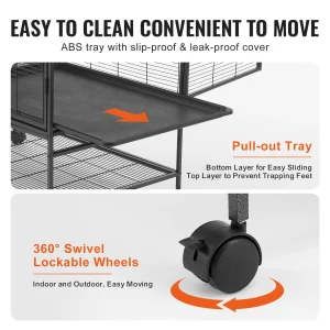 Easy to Clean: The removable platforms and grids make cleaning easy. The ABS-coated metal bottom tray fits tightly with the metal mesh to prevent urine leakage and foot injuries, providing a safe environment. The pull-out design and openable front door facilitate quick and convenient cleaning.